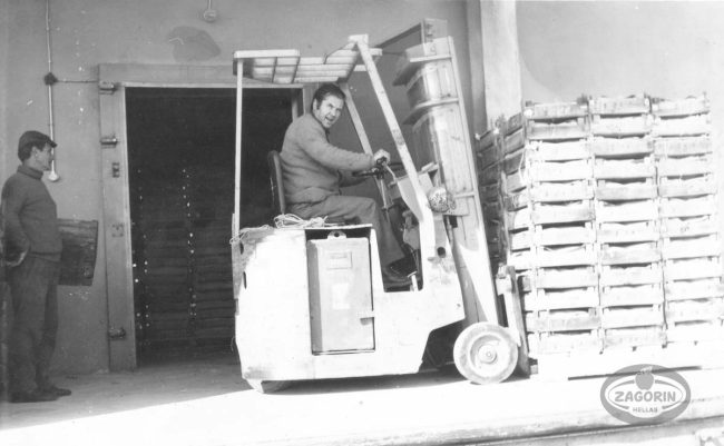 1975: Περονοφόρο  Ανυψωτικό. Ένα από τα πρώτα κλαρκ του Συνεταιρισμού στο οποίο χειριστής είναι ο Στέργιος Ευ. Τσαλούχος, επί δεκαετίες υπάλληλος του Συνεταιρισμού και μετέπειτα Πρόεδρος του Διοικητικού Συμβουλίου. Κατά τη λήψη μεταφέρει ξύλινα τελάρα που χρησιμοποιούνταν ως εργαλείο συσκευασίας. Η φωτογραφία προέρχεται από το ψηφιακό αρχείο του Συνεταιρισμού στον οποίο παραχωρήθηκε από τον Τσαλούχο…