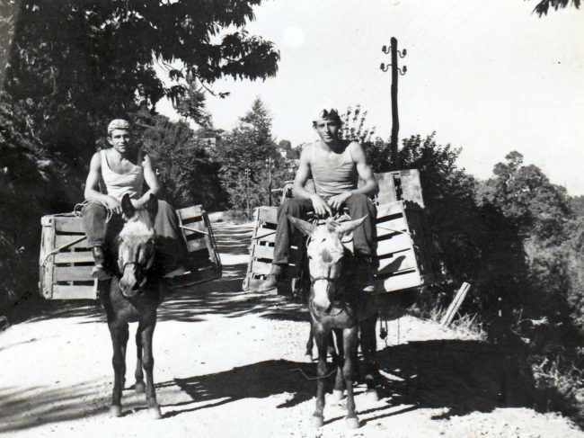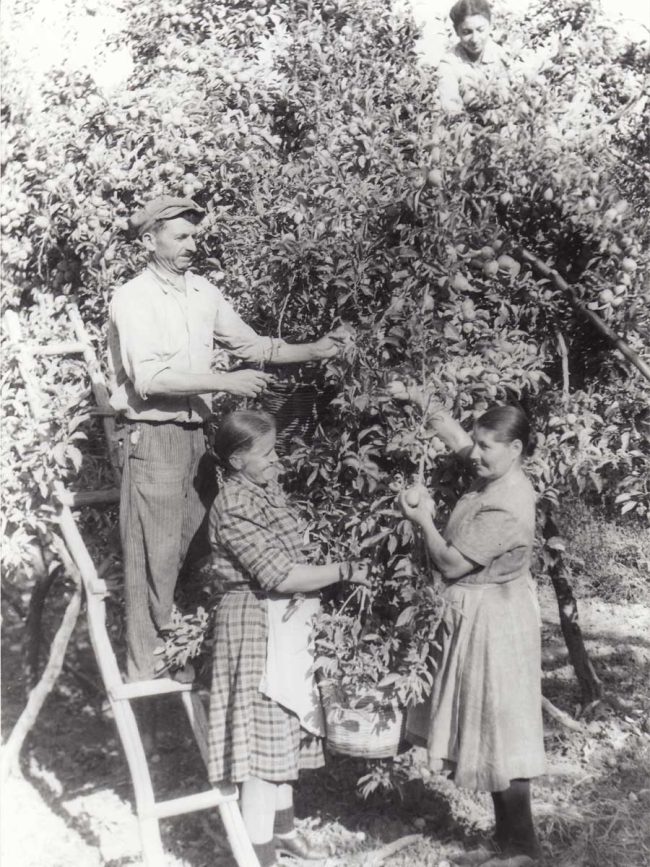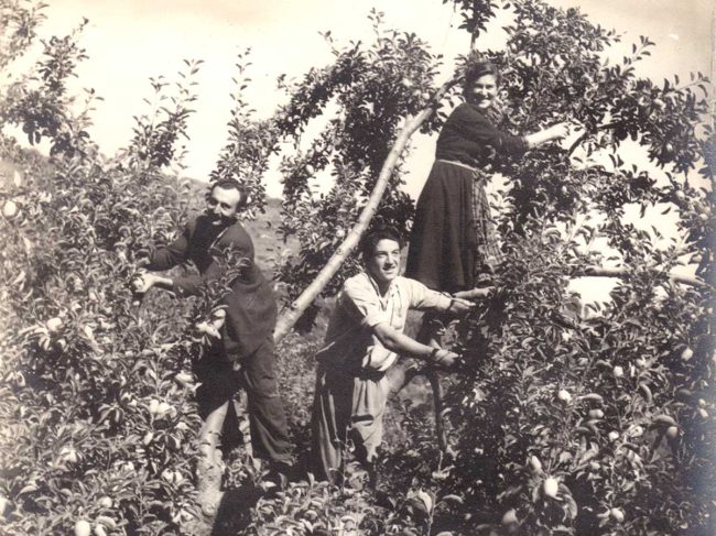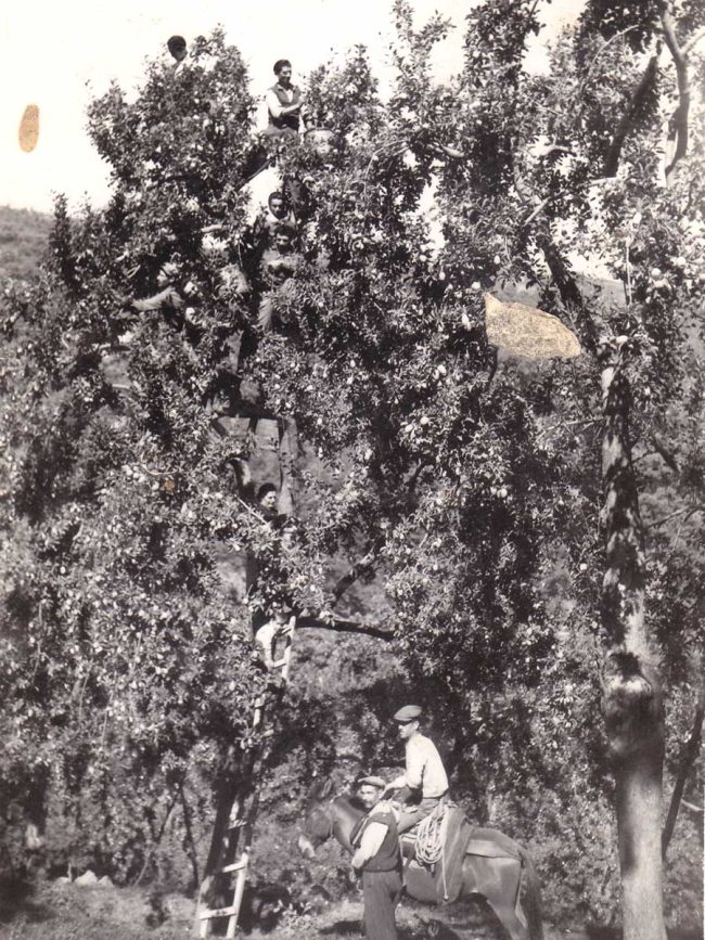 Φωτογραφία του Ζαγοριανού φωτογράφου Γεώργιου Γεωργούδη. Από αριστερά διακρίνονται ο Άγγελος Στάμος, η Ειρήνη Βοσταντζή, η Καλλιόπη Στάμου, ο Ευστάθιος Στάμος, ο Ιωάννης Στάμος του Γεωργίου ενώ πάνω στη μηλιά διακρίνονται από αριστερά η Μαρία Στάμου του Ευσταθίου, η Ελένη Στάμου του Άγγελου και ο μικρός Ιωάννης Στάμος του Ευσταθίου. Αρχείο: Μαρία Στάμου