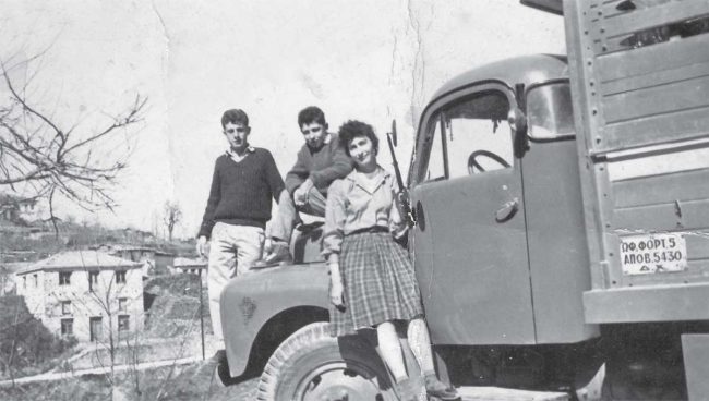 Τα πρώτα φορτηγά για το κουβάλημα των μήλων κάνουν την εμφάνισή τους στη Ζαγορά και οι ντόπιοι σπεύδουν να φωτογραφηθούν μαζί τους. Αρχείο Αλεξάνδρου Βαΐτση.