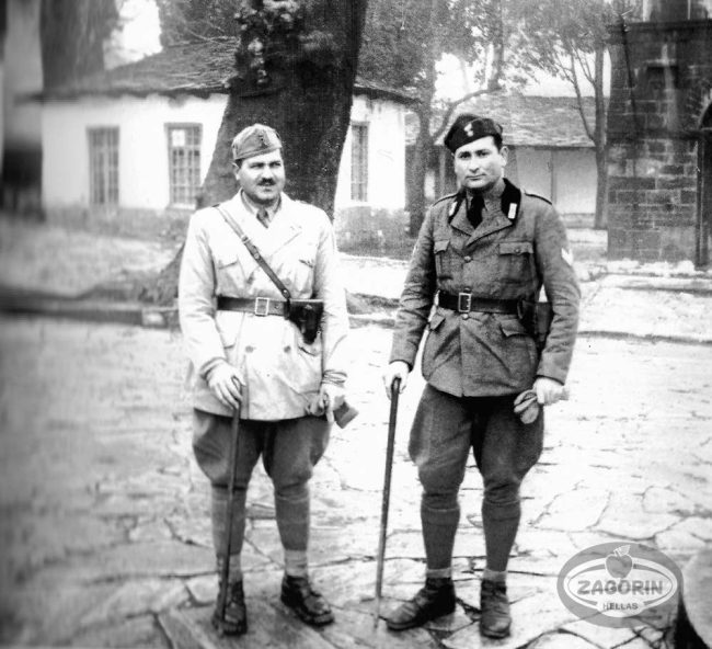 Ιταλοί στη Ζαγορά. Διακρίνεται ο διοικητής των ιταλικών κατοχικών δυνάμεων με τον υπασπιστή του, στην κεντρική πλατεία του Αγίου Γεωργίου Ζαγοράς. Η φωτογραφία προέρχεται από το ψηφιακό αρχείο του Συνεταιρισμού στον οποίο παραχωρήθηκε από τον Αλέξανδρο Καπανιάρη κατόπιν προσφοράς του Χαράλαμπου Αλεξάνδρου.